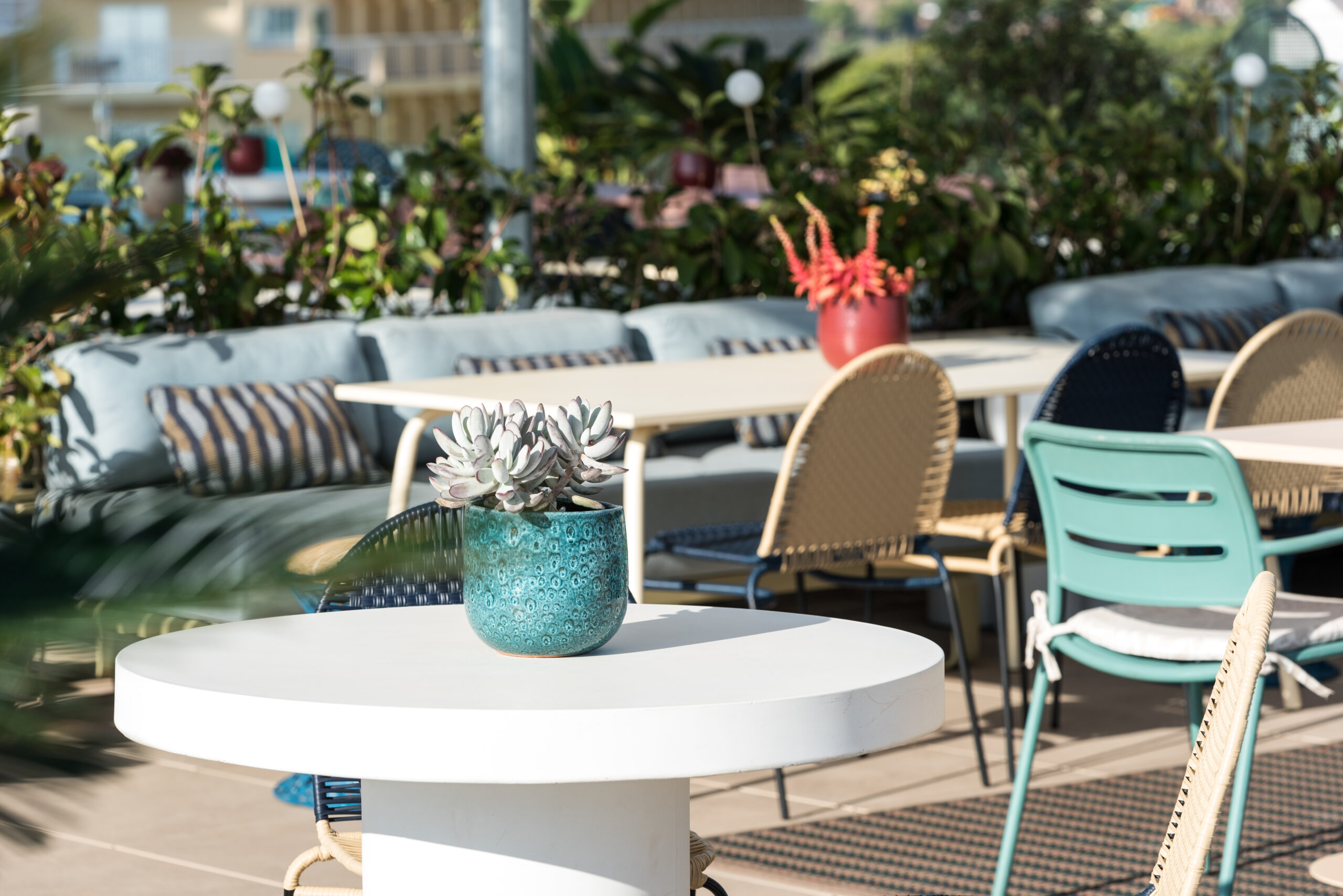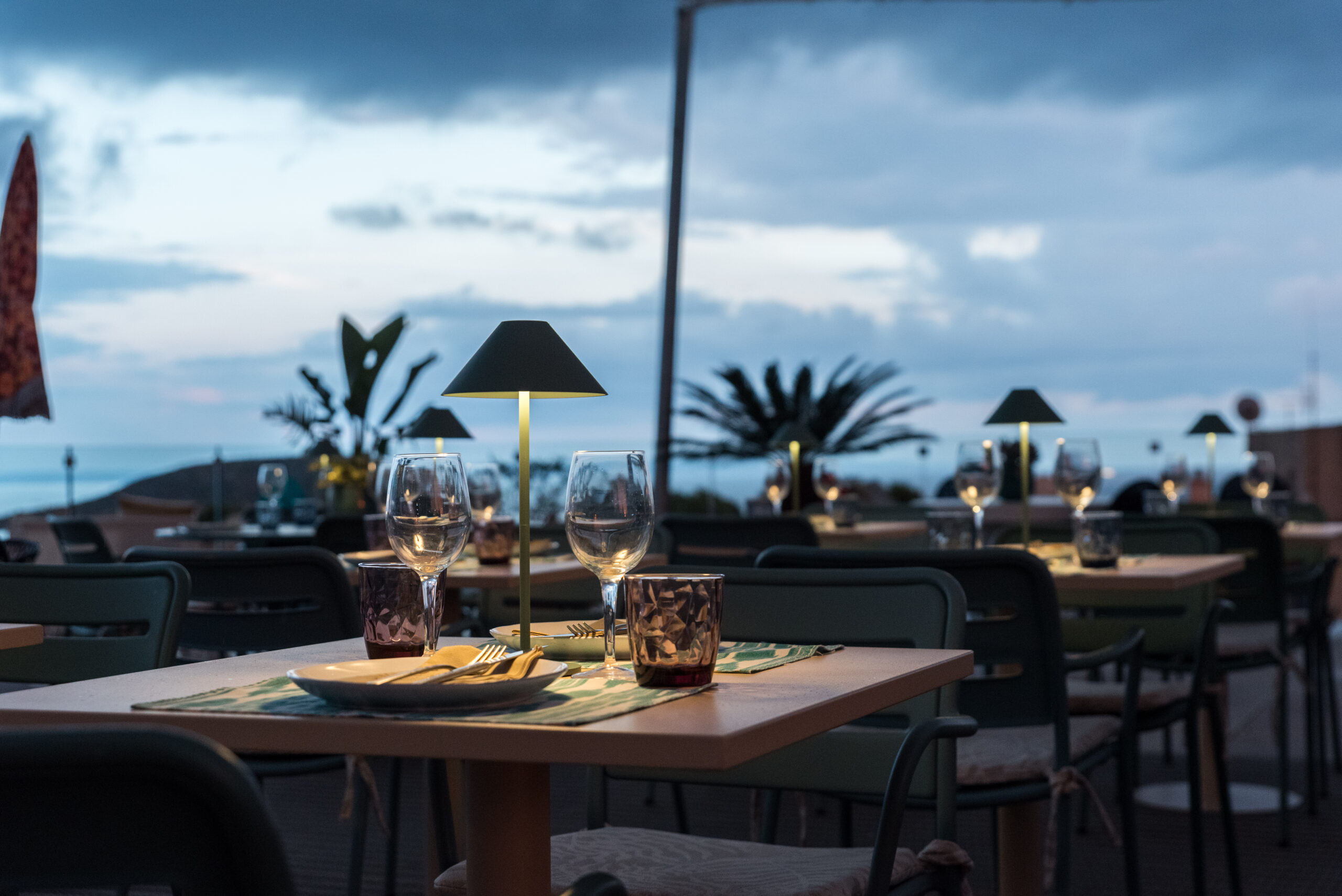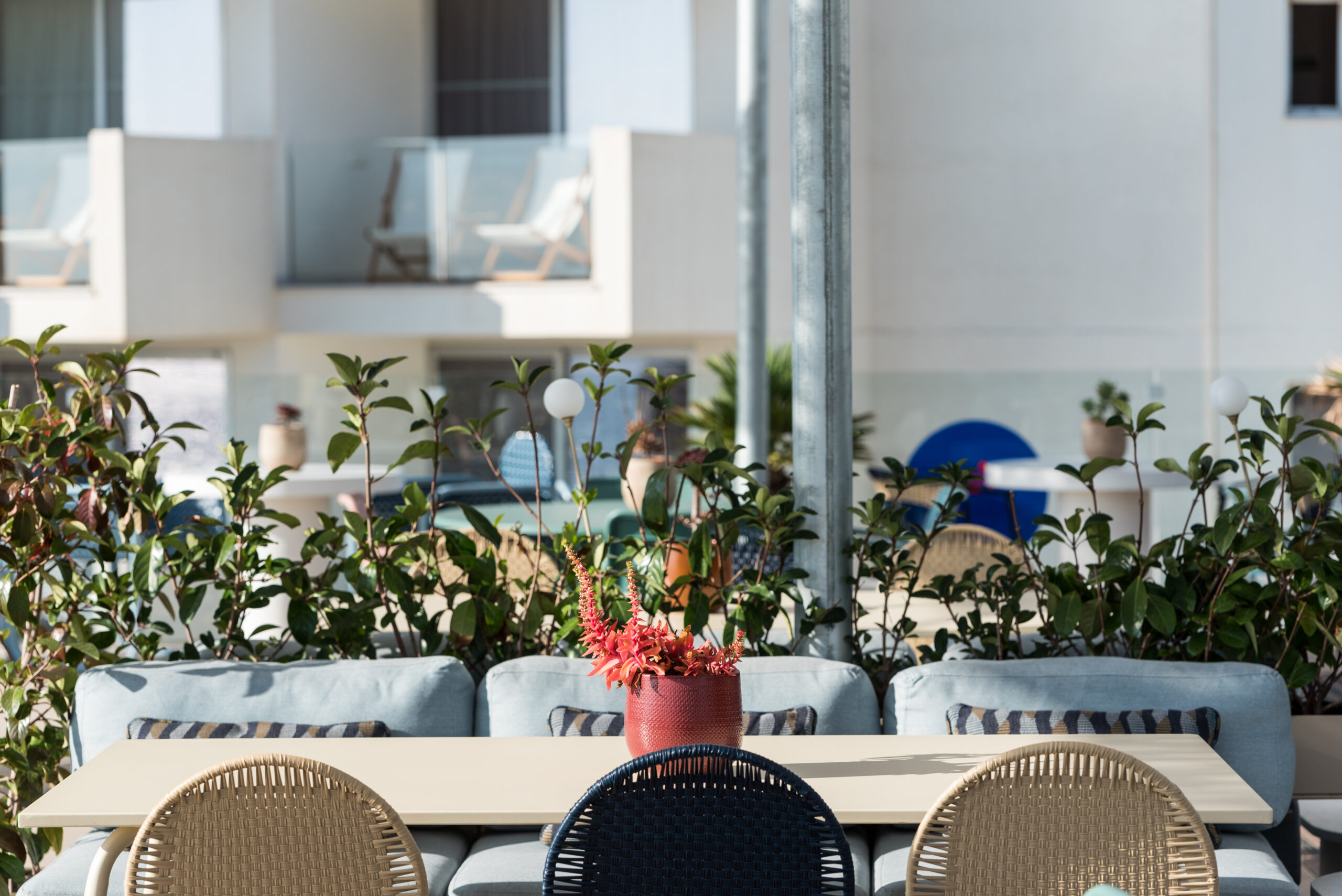 Se ha jugado con diferentes formas de sentarse para que la experiencia siempre sea diferente y huir de la monotonía. Entran en juego, en la zona central, bancadas, mesas cuadradas que nos dan cierta polivalencia, mesas redondas para grupos, y un perímetro tratado de una manera más “chill” e informal a partir del uso de butacas bajitas orientadas a la playa, lo cual nos permite ofrecer al usurario final la posibilidad de comer de una manera formal en esa zona central mencionada anteriormente y poder disfrutar después de esa comida o cena, de una manera más relajada y distendida de una copa o un cocktail.