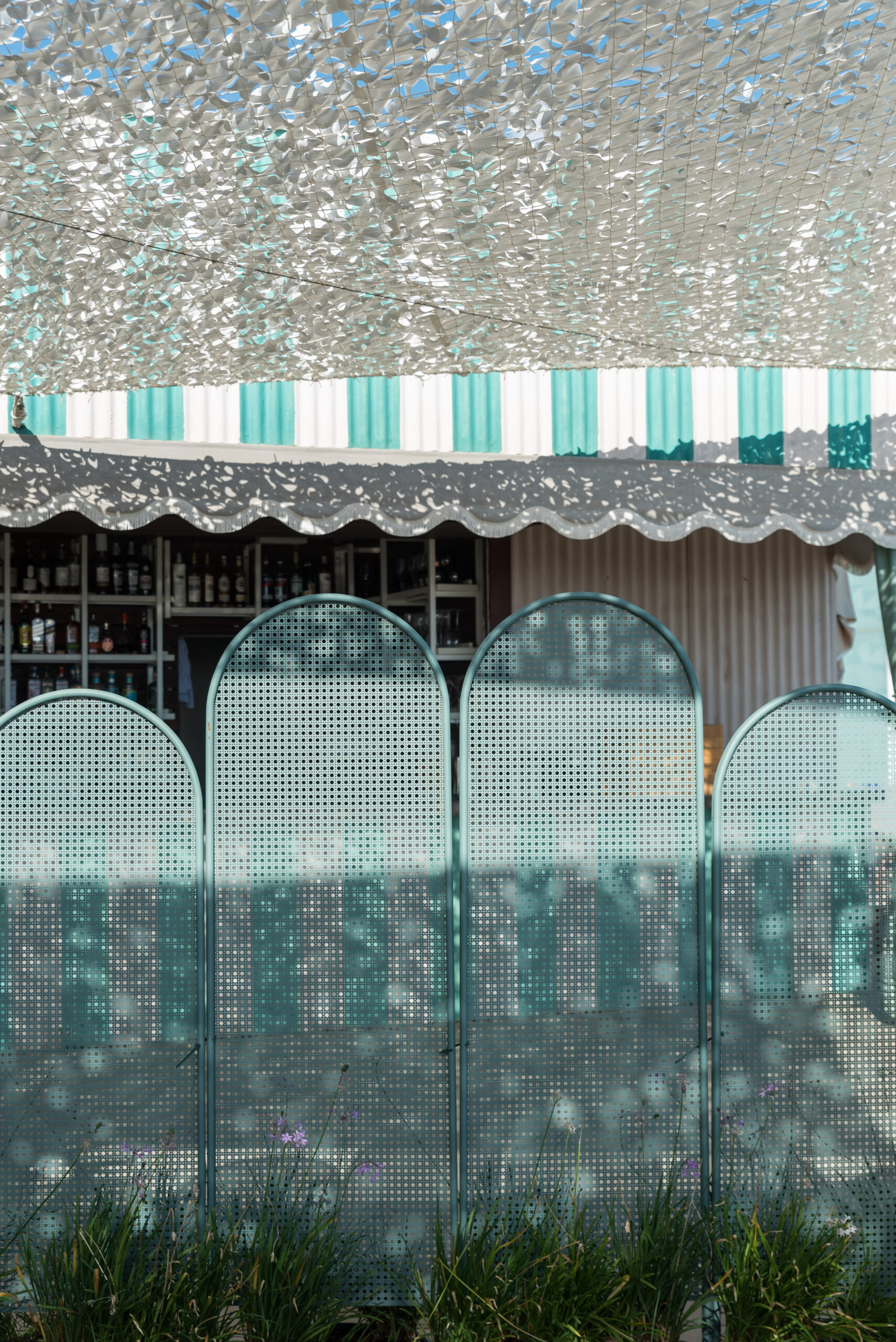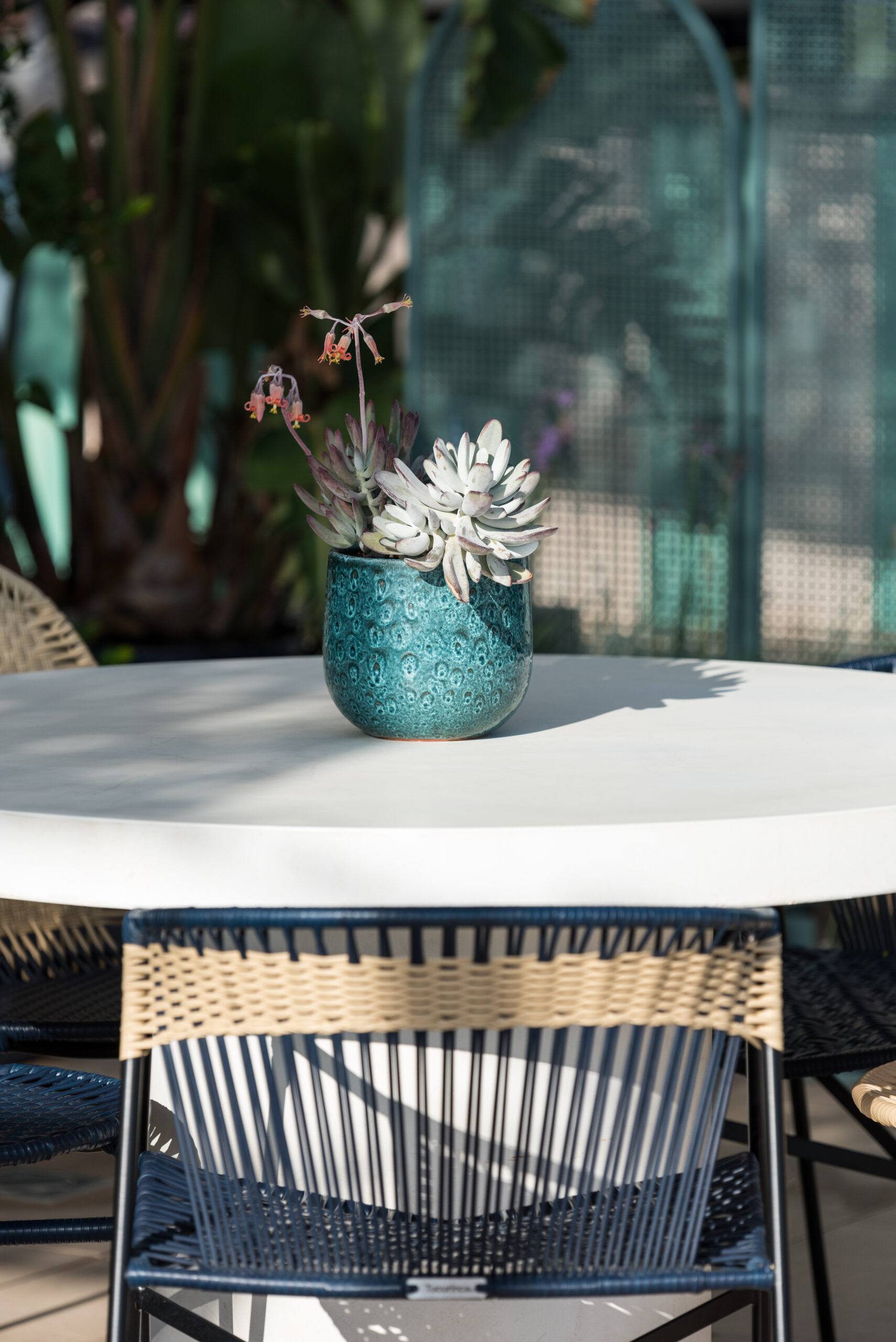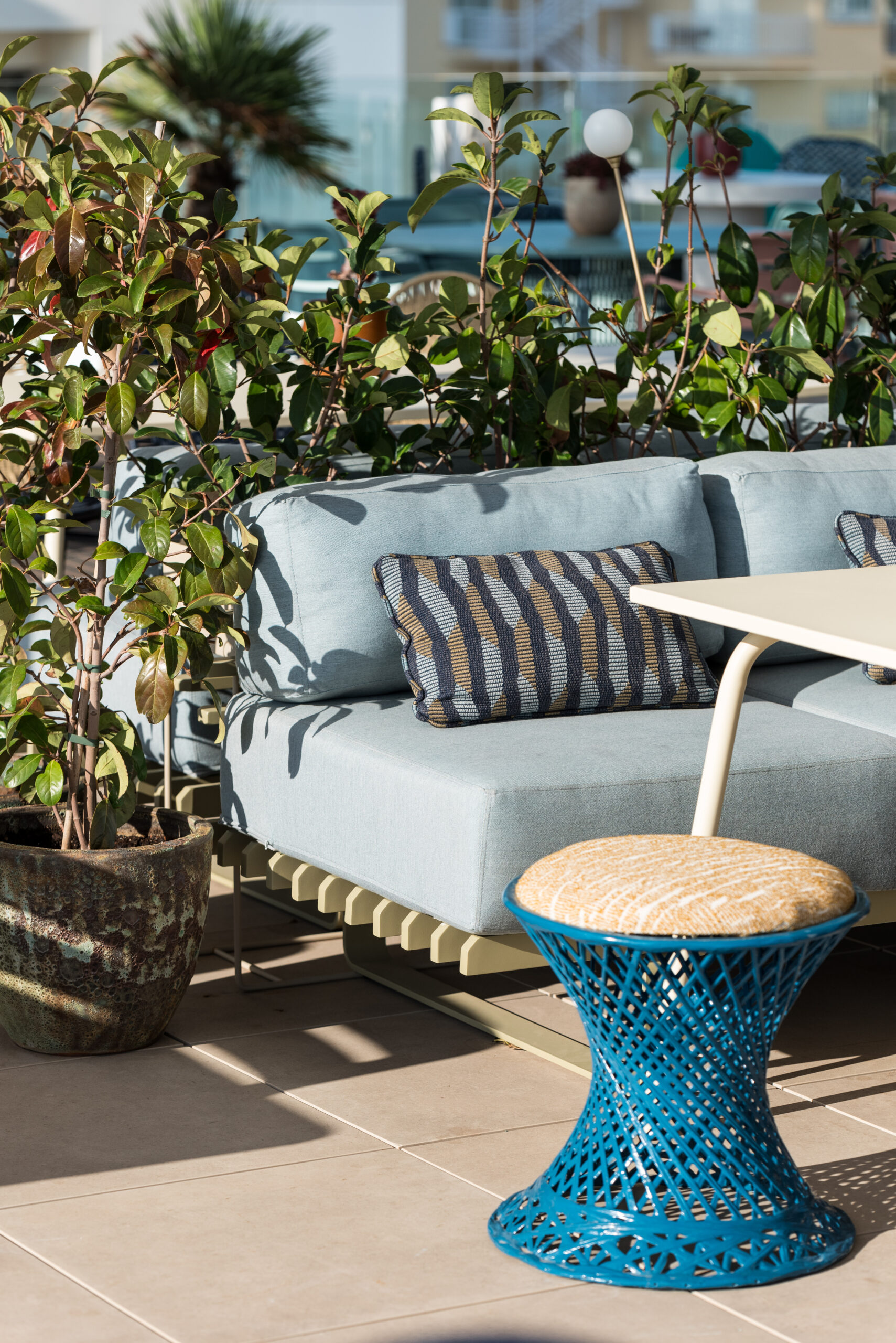 Se ha jugado con diferentes formas de sentarse para que la experiencia siempre sea diferente y huir de la monotonía. Entran en juego, en la zona central, bancadas, mesas cuadradas que nos dan cierta polivalencia, mesas redondas para grupos, y un perímetro tratado de una manera más “chill” e informal a partir del uso de butacas bajitas orientadas a la playa, lo cual nos permite ofrecer al usurario final la posibilidad de comer de una manera formal en esa zona central mencionada anteriormente y poder disfrutar después de esa comida o cena, de una manera más relajada y distendida de una copa o un cocktail.